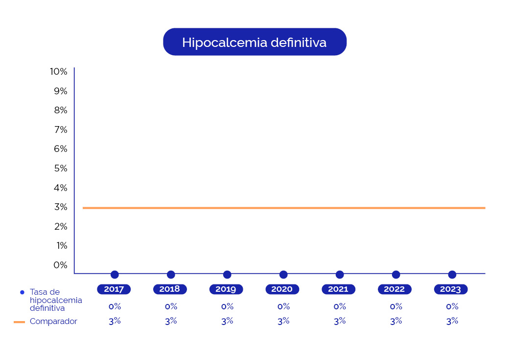 Hipocalcemia definitiva: es la disminución sostenida del nivel del calcio en sangre ocasionada por la alteración del funcionamiento de las glándulas paratiroides y que requiere recibir calcio en forma permanente.