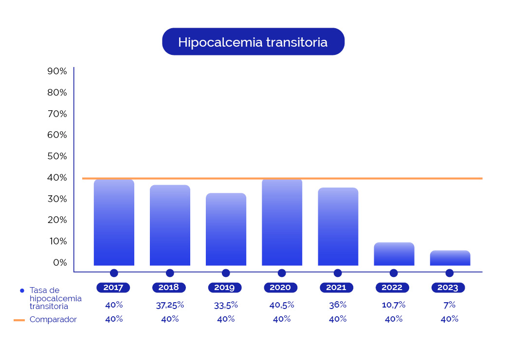 Hipocalcemia transitoria: es la disminución temporaria del nivel de calcio en sangre ocasionada por la alteración del funcionamiento de las glándulas paratiroides y que requiere recibir calcio por un tiempo limitado.