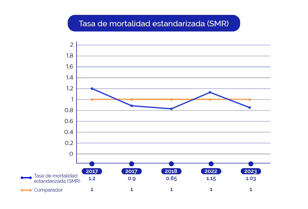 Como la mayoría de las muertes hospitalarias en pediatría ocurren en la UCIP, la mortalidad de la UCIP puede reflejar la atención médica de un hospital y la calidad y eficiencia en el manejo de niños críticos. Para esto es necesario comparar la mortalidad real con la mortalidad esperada. La mortalidad esperada se evalúa al ingreso de los pacientes a la UCIP. Según las características clínicas, se asigna un puntaje de riesgo de mortalidad a cada paciente a través de escalas validadas en el mundo y en el país. Periódicamente se promedian los puntajes de los pacientes y se compara el resultado con la mortalidad real de la unidad. La resultante de este promedio se denomina tasa de mortalidad estandarizada o SMR por sus siglas en inglés (SMR: mortalidad observada/mortalidad esperada). Una SMR menor a 1 quiere decir que la mortalidad es menor a la esperada, mientras que una SMR superior a 1 indica que la mortalidad en la UCIP es mayor a la esperada.