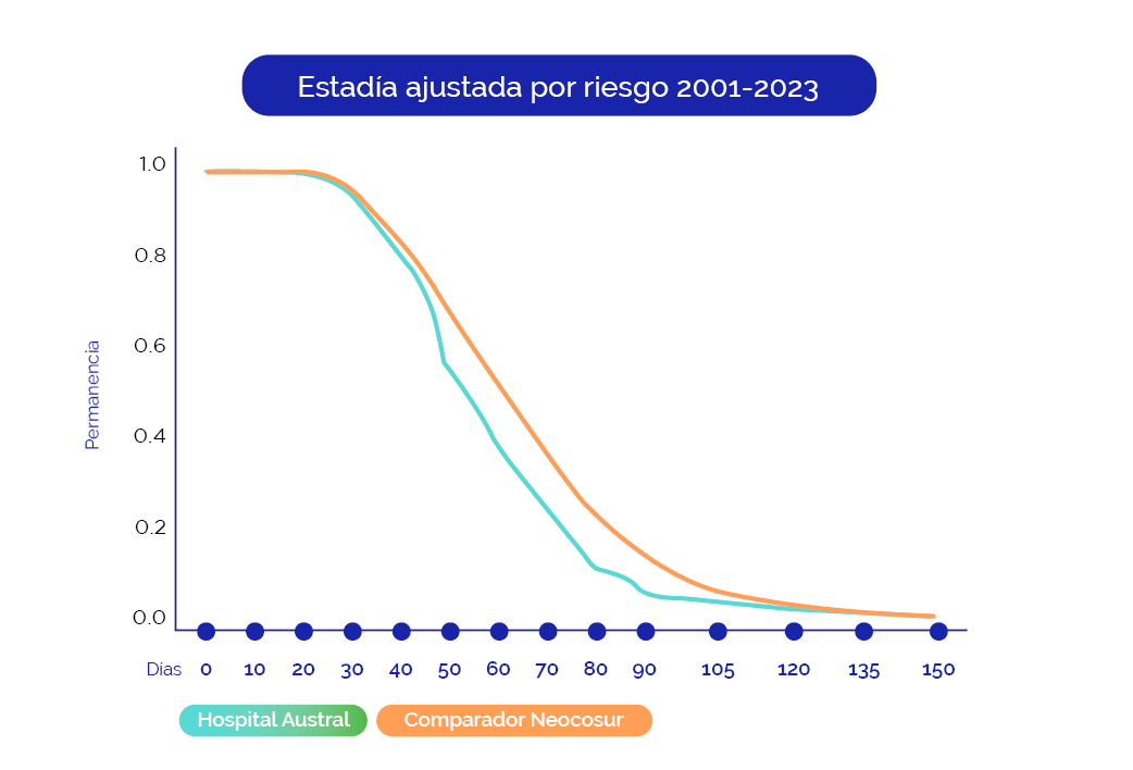 De la misma manera y con la finalidad de contar con herramientas para la mejora continua se desarrolló en la Red un comparador ajustado para la estadía en internación en la población de RNMBP. A pesar de contar con una de las sobrevidas más altas de la Red nuestros pacientes se van de alta más pronto que el promedio.