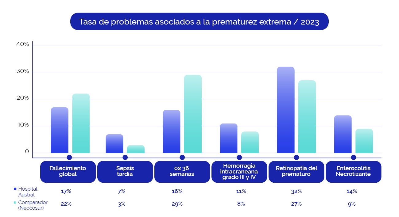 El gráfico muestra nuestros resultados para los principales problemas asociados a la prematurez extrema comparándolos con el total de la Red.