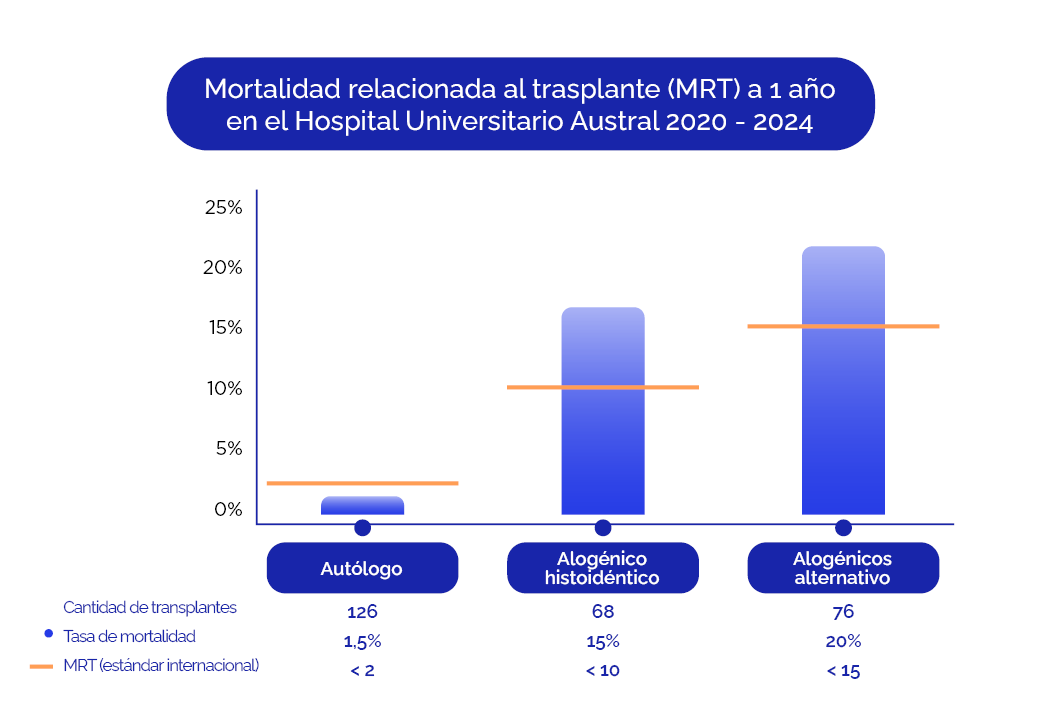 El trasplante hematopoyético es un procedimiento complejo, de alto riesgo. El indicador que muestra con mayor fidelidad la calidad de cuidado de los pacientes, es la mortalidad relacionada al trasplante. Este indicador varía según el tipo de trasplante: