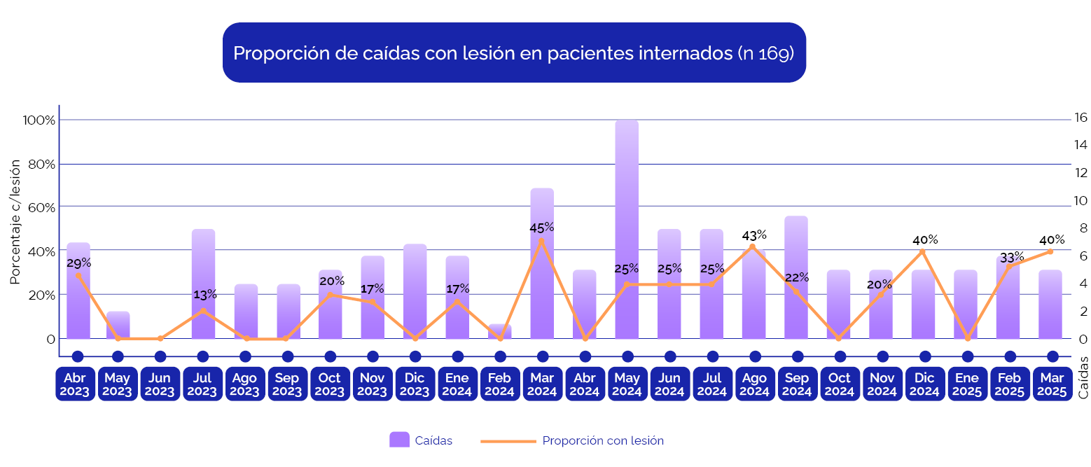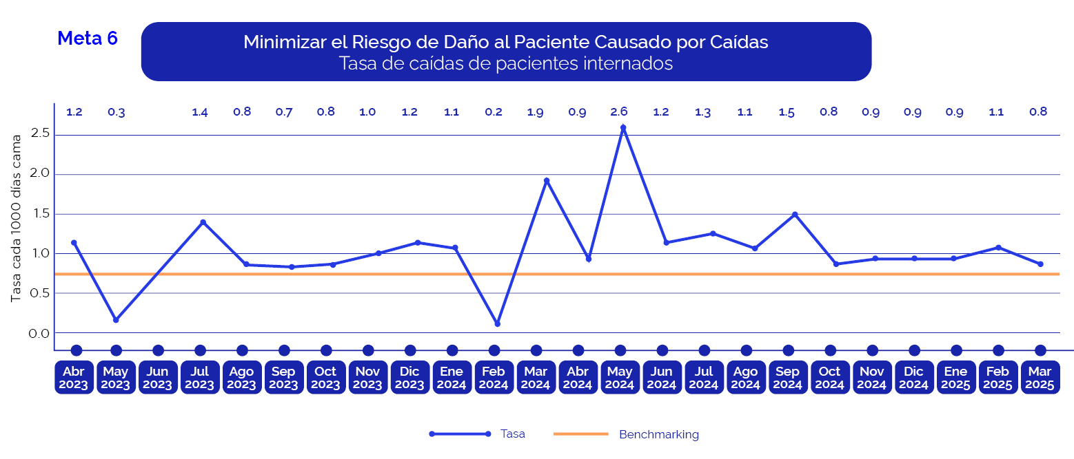 De acuerdo a la literatura disponible, las caídas de la cama u otros lugares en el marco de los cuidados asistenciales constituyen una causa importante de lesiones sufridas por pacientes hospitalizados. El Hospital Universitario Austral ha implementado un proceso de prevención de caídas para todos sus pacientes internados, con el objetivo de reducir el daño causado por caídas y establece procedimientos específicos para reducir tales riesgos. Para estos efectos el estándar establecido es encontrarnos por debajo de la tasa promedio de caídas reportada internacionalmente (EEUU) y trabajar activamente en la reducción de la misma.