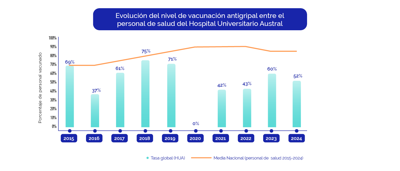Desde la pandemia de gripe H1N1 el Hospital Universitario Austral se encuentra comprometido en alcanzar el máximo nivel de adherencia a la vacunación antigripal entre su personal. Si bien esta recomendación resulta difícil de cumplir en la medida que nos alejamos de la pandemia continuamos trabajando para mantener el nivel logrado.